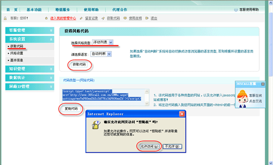 點(diǎn)擊“獲取代碼”按鈕,得到代碼,點(diǎn)擊“復(fù)制代碼”,選“允許訪問”,就把獲取的代碼復(fù)制好了,這時只要再粘貼“到網(wǎng)站的相關(guān)頁面的 </html> 的前一行”即可。