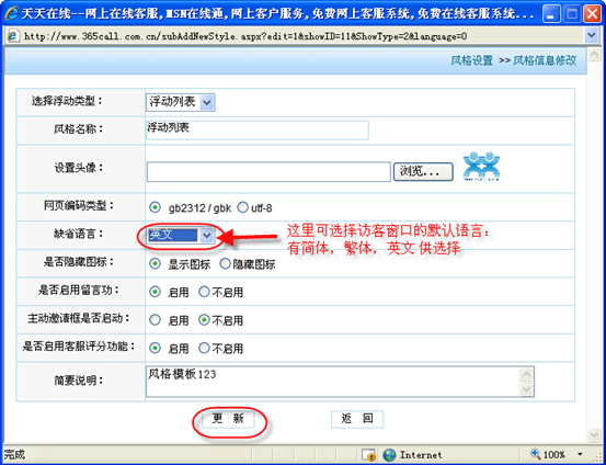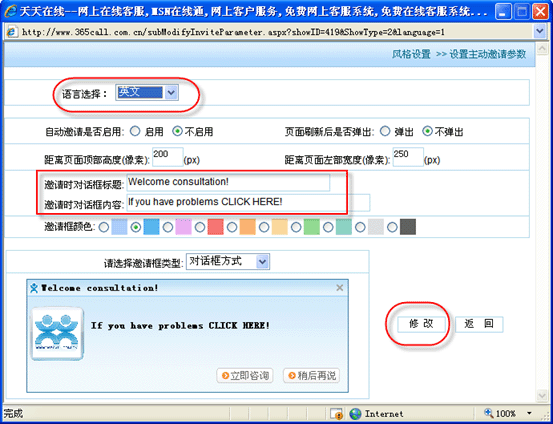 再次點擊“系統(tǒng)設(shè)置”->“風(fēng)格設(shè)置”->“主動邀請設(shè)置”,彈出主動邀請設(shè)置頁,在“語言選擇”選擇要設(shè)置的語言種類,輸入完畢信息后,點擊“修改”按鈕: