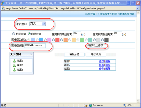 然后點擊“系統(tǒng)設(shè)置”->“風(fēng)格設(shè)置”->“客服圖標設(shè)置”,彈出客服圖標設(shè)置頁,“語言選擇”欄選擇需要設(shè)置的語言,“漂浮框標題”欄輸入需要設(shè)置的該語言的標題,然后點擊“確認以上修改”: