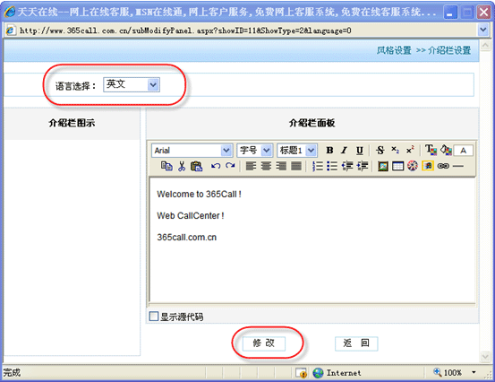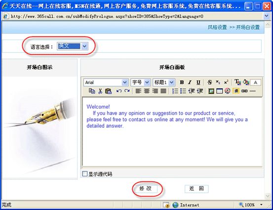 再次點擊“系統(tǒng)設(shè)置”->“風(fēng)格設(shè)置”->“開場白設(shè)置”,彈出開場白設(shè)置頁,在“語言選擇”選擇要設(shè)置的語言種類,輸入完畢信息后,點擊“修改”按鈕: