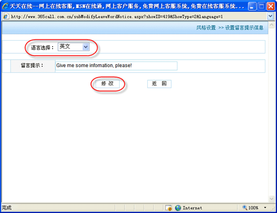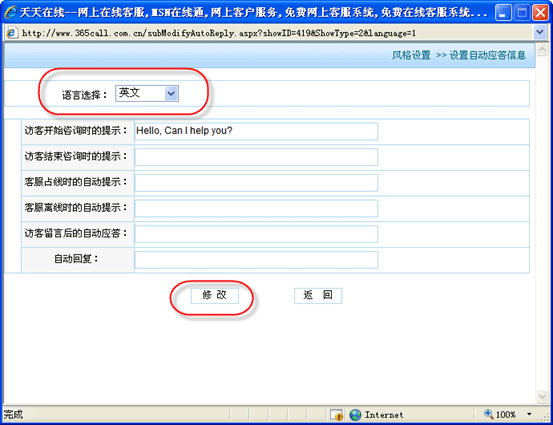 再次點擊“系統(tǒng)設(shè)置”->“風(fēng)格設(shè)置”->“自動應(yīng)答”,彈出自動應(yīng)答信息設(shè)置頁,在“語言選擇”選擇要設(shè)置的語言種類,輸入完畢信息后,點擊“修改”按鈕:
