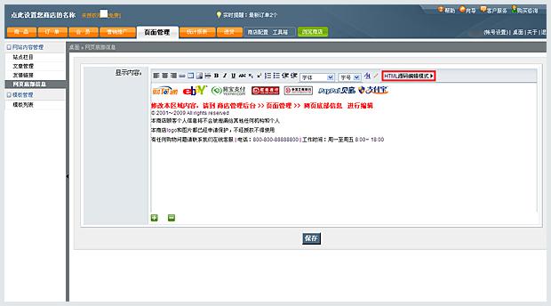 獲取在線客服安裝代碼,然后進入SHOPEX4.6網站后臺,選擇菜單"設置"->"系統(tǒng)設置"->"版權信息",然后點擊窗口底部"HTML"按鈕,切換到源代碼界面,將在線客服代碼加入到版權信息代碼后面保存即可; 或進入SHOPEX4.8網站后臺,選擇菜單"頁面管理"->"網站內容管理"->"網頁底部信息",然后點擊窗口右上角"HTML源碼編輯模式"按鈕,切換到源代碼界面,將在線客服代碼加入到網頁底部信息代碼最后面保存即可。