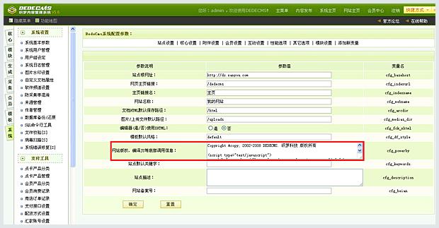 首先獲取在線客服安裝代碼,然后登陸DeDecms后臺(tái),進(jìn)入系統(tǒng)》系統(tǒng)基本參數(shù),復(fù)制在線客服